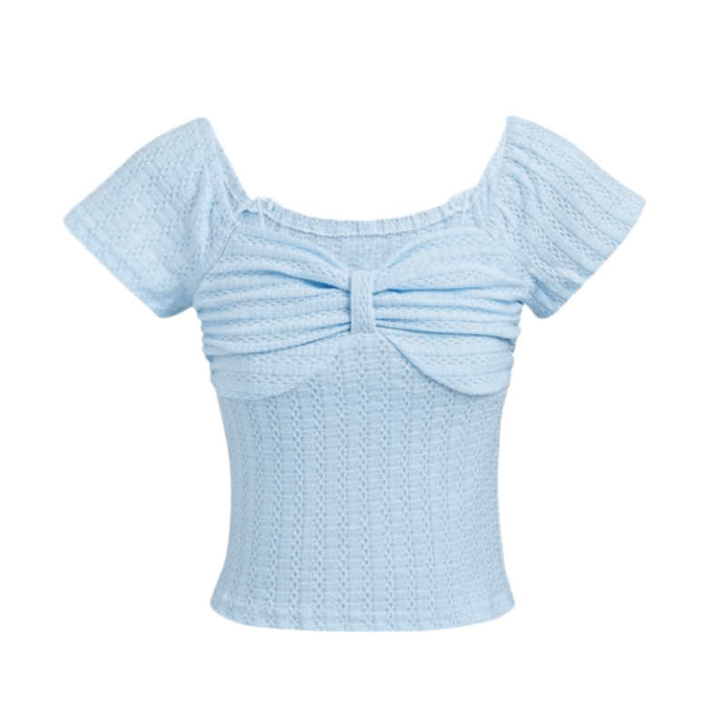 - Elevate your style with this T-shirt featuring pleats, a bow design, and a faux two-piece look for a chic and sophisticated ensemble.
